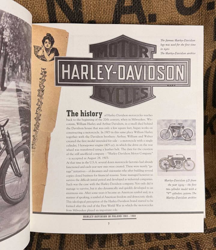 A detailed history of Harley‑Davidson from its founding in 1903 to its presence in Poland — including its use during wartime, by postal services, police and military, and adoption by motorcycle clubs and enthusiasts after the wars